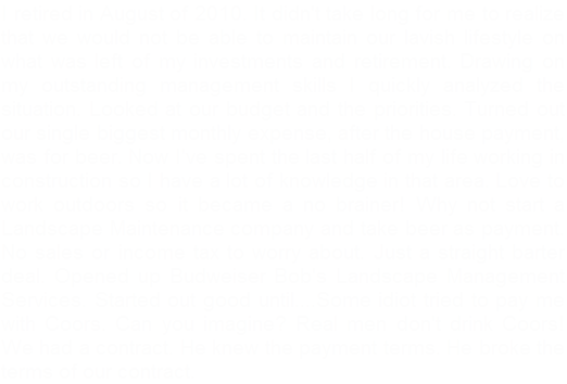 "Enjoy Life! Just Don't Let Your Wife Know How Much Fun You're Having!" Budweiser Bob: August 2013 There's Only 2 Kinds Of Beer. Budweiser And Free! My Net Worth 2003 Thru 2013 How We Went From Riches To Rags! OK, you work hard all your life saving up for the day when you can retire, relax and enjoy life. Then it happens. Bam! The economy goes in the toilet. Your home and investments are now worth 25% of what they were. A normal person would suck it up and postpone retirement. Not us! We're the Arizona Goebels! So, I gave up my job with a 6 figure income and took retirement as originally planned. Surely we can get by on what's left of my investments. Hell, if necessary, I can come up with a part time home business to fill in the gaps. So," How's That Working Out", you ask? Read On.... In the Beginning....... Fast Forward To Today.